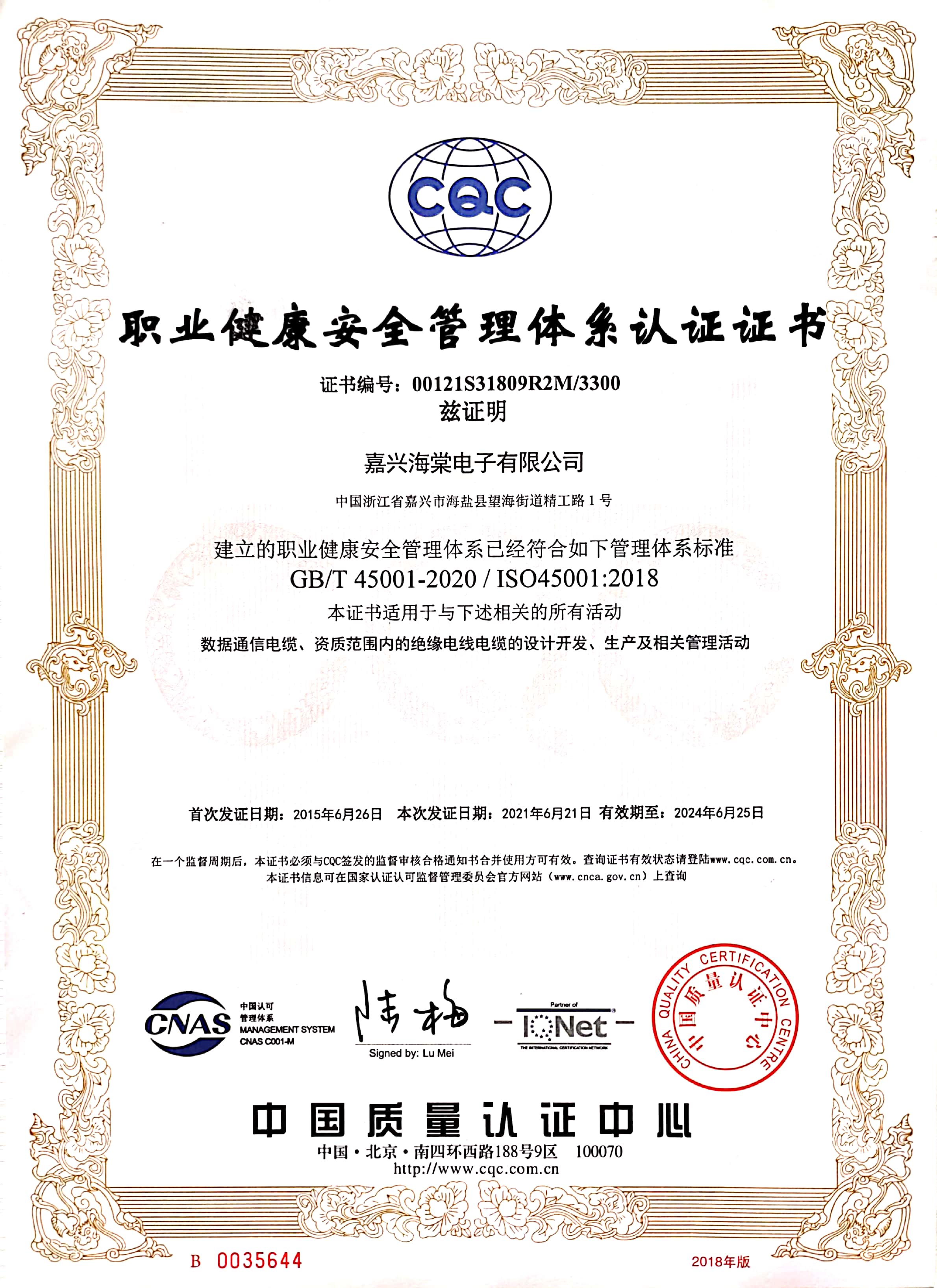 質(zhì)量體系證書