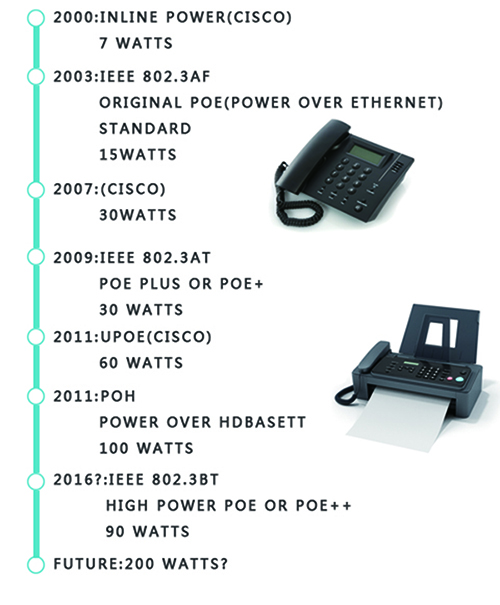 IEEE 802.3at標準2005年開始制定,2009年頒布。802.3at標準的輸出功率可達30W,受電端可用功率為25.5W。