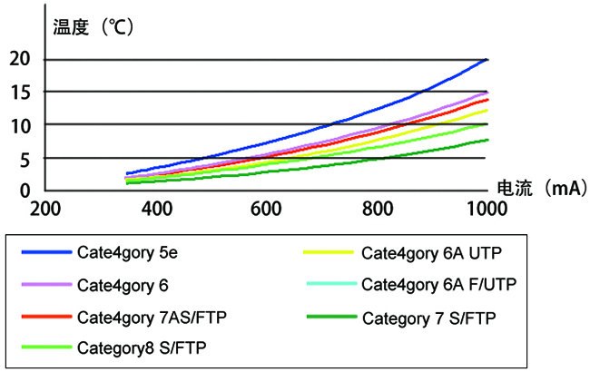 從圖表我們可以看到,隨電流增大,網(wǎng)線的溫度也隨著增加。當相同電流時,網(wǎng)線類別越高,溫度越低。