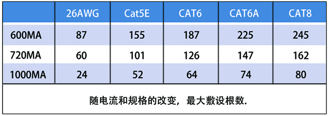 由表可以看出,同一規(guī)格下,電流增大,在安全條件下,最大敷設根數(shù)減?。浑娏骱愣〞r,網(wǎng)線類別越高,最大敷設根數(shù)越大。