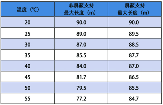 下圖為不同環(huán)境溫度下網(wǎng)線支持的最大長度: