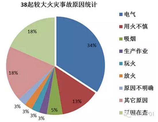其中,38起較大火災(zāi)事故原因中,第一位是電氣引發(fā)事故共13起,占34%。
