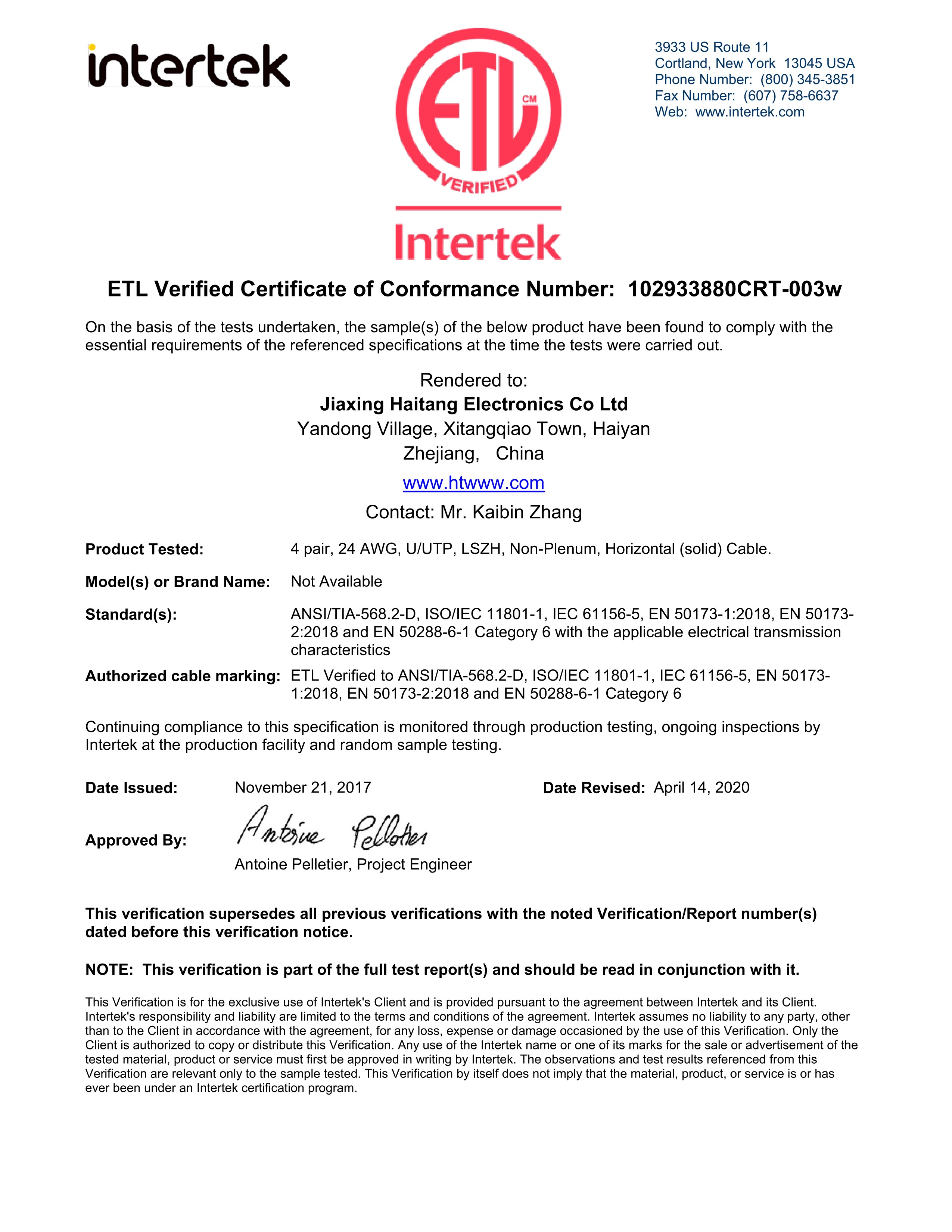 UUTP CAT6A 24AWG LSZH ETL性能認證